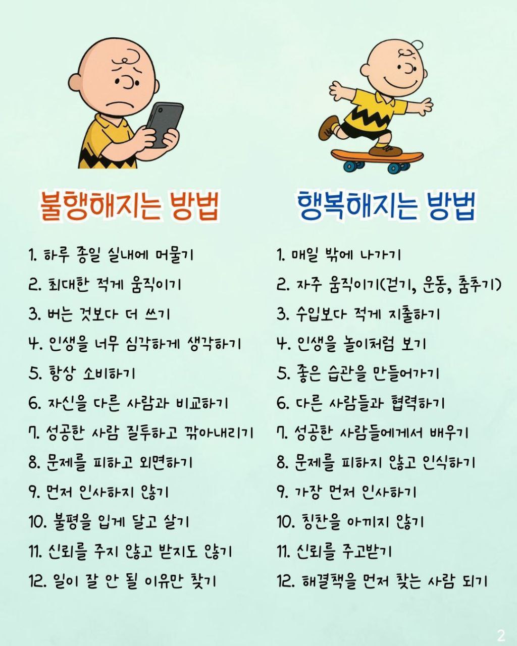 이 콘텐츠는 불행해지는 방법 12가지와 행복해지는 방법 12가지를 대조하여 보여줍니다. 불행해지는 방법은 주로 부정적인 태도와 행동에 초점을 맞추고 있으며, 행복해지는 방법은 긍정적인 태도와 적극적인 행동을 강조합니다.