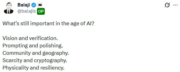 ✖️AI 시대에 여전히 중요한 것들 source 1. 비전과 검증 - 나아가야 할 방향 설정임. AI는 속도가 빠르지만 방향성이 필요하며 인간은 그 방향에 집중해야 함 - AI가 의도대로 작동하는지 확인하는 과정임. AI끼리 서로 비판하게 할 수 있으나 최종 판단은 인간의 몫 2. 프롬프팅과 다듬기 - 원하는 바를 명확한 언어로 표현하는 능력임. 어휘력이 풍부할수록 훨씬 더 유리 - AI는 중간 과정에는 능하지만 완결성이 부족함. AI가 크레인처럼 건물을 세울 수 있어도 마지막에는 인간의 핀셋 작업이 필요 3. 커뮤니티와 지리 - 온·오프라인의 연결성임. 소프트웨어가 급변해도 변치 않고 일정하게 유지되는 가치 - 법적 규제를 결정하는 물리적 위치임. 인터넷은 겉보기에 균일해 보이지만 실제로는 지역적 차이가 존재 4. 희소성과 암호학 - 로봇, 주택, 자동차 등 물리적 자산과 유통의 희소성임. 쉽게 복제되는 비트와 대비되는 물리적 원자의 가치 - AI가 할 수 없는 영역임. LLM은 미분방정식은 풀어도 이산로그 문제는 풀지 못함. 조작하기 쉬운 데이터와 구분되는 위조 불가능한 정보의 영역 5. 물리성과 회복탄력성 - AI가 진정으로 활약할 분야임. 에세이 완성도를 판단하는 것보다 상자가 테이블 위에 있는지 확인하는 물리적 과업의 검증이 훨씬 쉬움 - 지출을 줄이고 커뮤니티를 강화하며 다가올 혼란을 견딜 수 있는 적절한 위치와 자산을 선택하는 능력