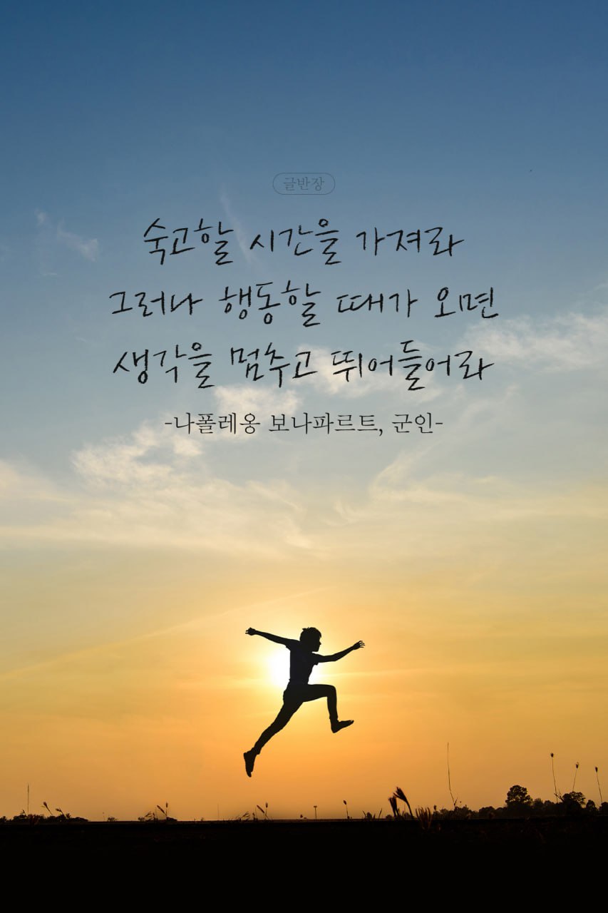 숙고할 시간을 가져라. 그러나 행동할 때가 오면 생각을 멈추고 뛰어들어라. -나폴레옹 보나파르트, 군인-